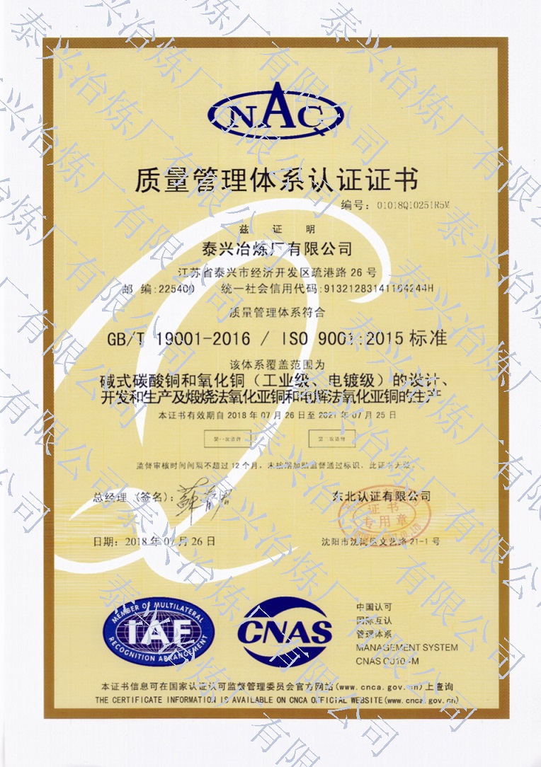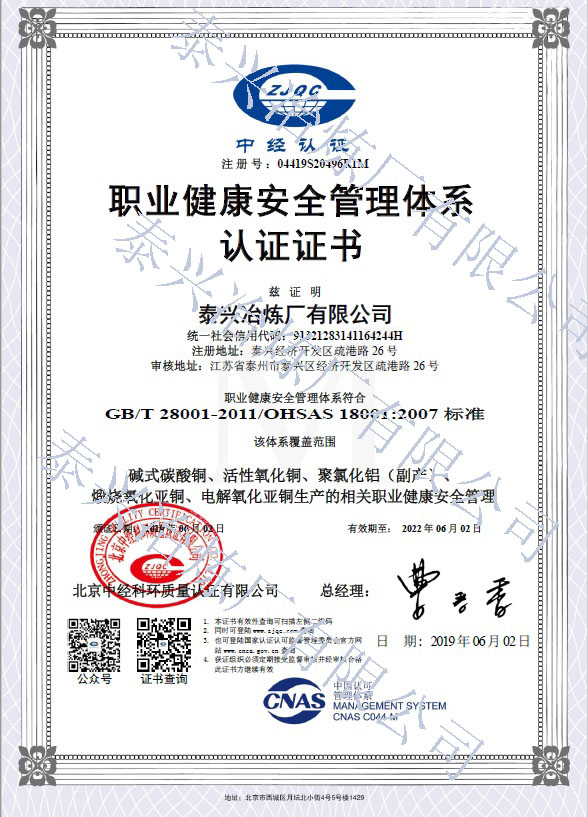 泰興冶煉廠有限公司(原泰興冶煉廠),始建于20世紀70年代初,現位于江蘇省泰興經濟開發(fā)區。歷經40年的創(chuàng)新驅動、穩(wěn)健發(fā)展,已成長為一家專業(yè)生產堿式碳酸銅、高純電鍍氧化銅、氧化亞銅、氧化銅、無水硫酸銅、海綿銅粉及副產品聚氯化鋁(凈水劑)等系列無機鹽產品及處置不含氨的氯化銅蝕刻液(HW22)15000噸/年的“國家高新技術企業(yè)”和地方性骨干企業(yè)。公司總占地面積3.7萬平方米,建筑面積4萬平方米,注冊資本2088萬元,固定資產1.2億元,年產值約7億元。